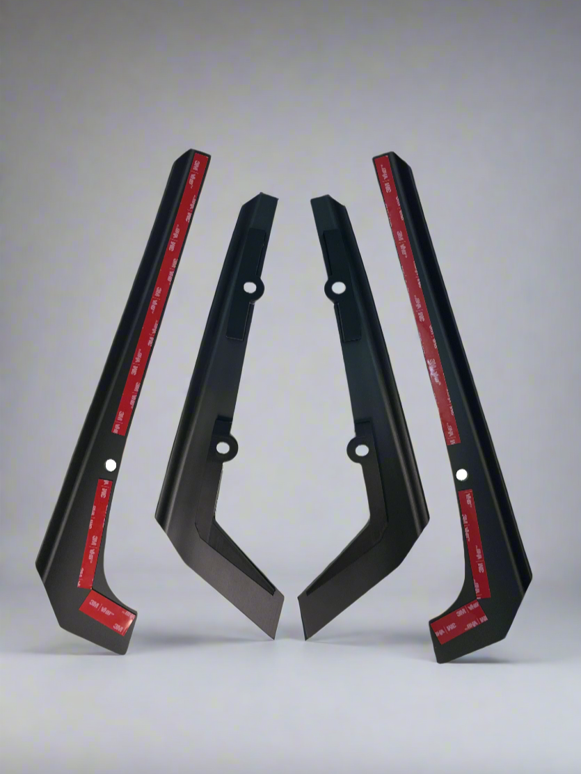 The front guards mount with 3M™ VHB™ adhesive tape, while the rear guards are fastened to the bumper with 3D-printed brackets and the original hardware.